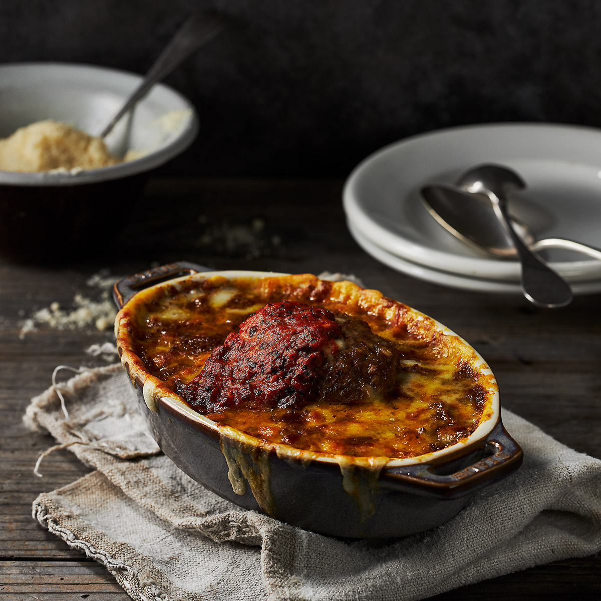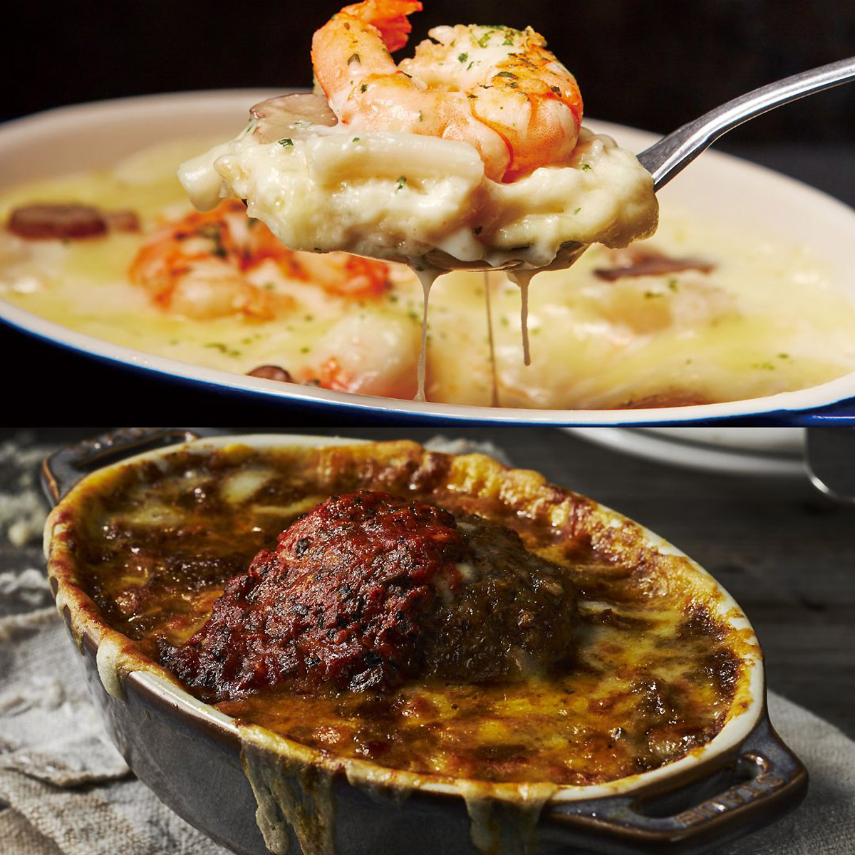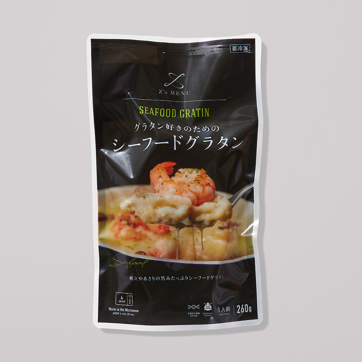 [グラタン好きのためのシーフードグラタン]大きめのえびと帆立が存在感のある濃厚シーフードグラタン。牛乳、クリーム、バターなど乳製品は北海道産を使用。あさりのソテーに牛乳と生クリーム、帆立の煮汁を合わせて仕上げた、魚介の旨みがぎゅっとつまった特製ベシャメルソースが決め手です。