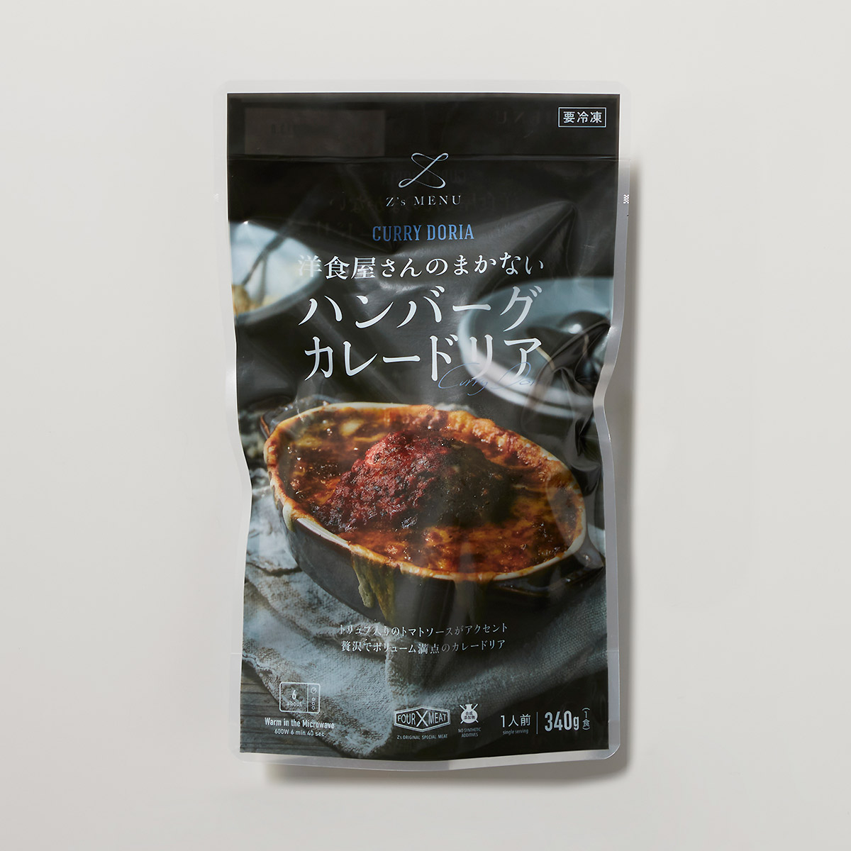 [洋食屋さんのまかないハンバーグカレードリア]自社ブランド牛「4Xビーフ」100%のハンバーグがトッピングされたボリューム満点のカレーハンバーグドリアです。ライスはターメリックバターライス。味のアクセントにトリュフ入りトマトソースを上にかけた贅沢な仕上げです。