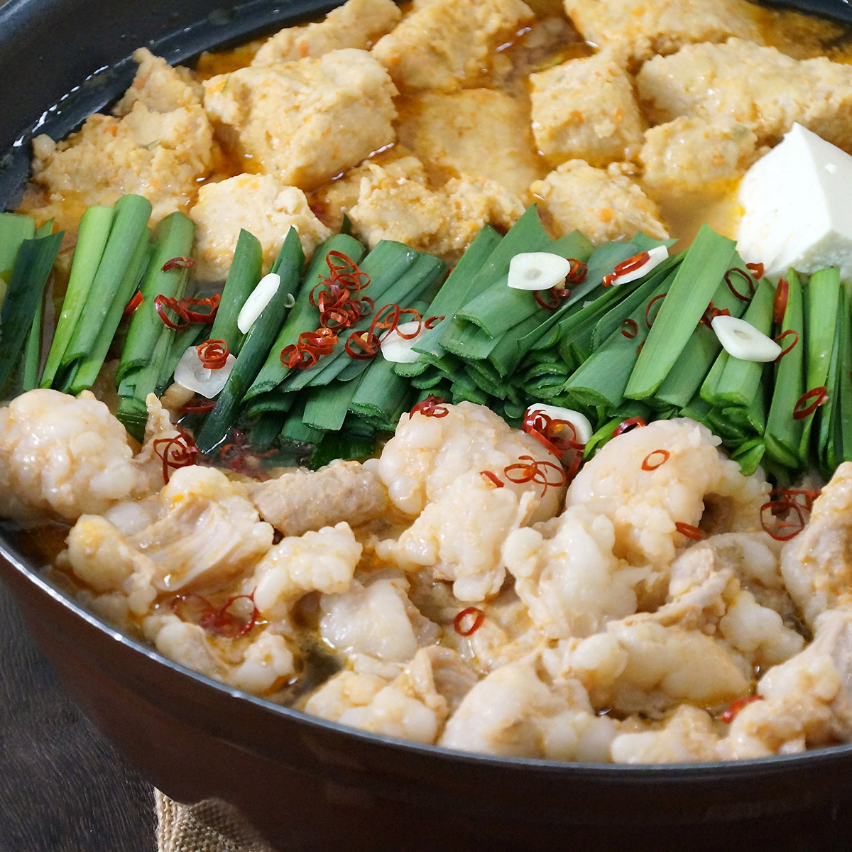 ◎ネット限定品北海道産牛のモツに鶏ツミレをセット。チョッピリ辛いスープが具材の旨味を引き立てます。締めには添付のラーメンを入れてお楽しみください。モツはたっぷり400gお届けしますので、お腹いっぱいお楽しみ頂けます。