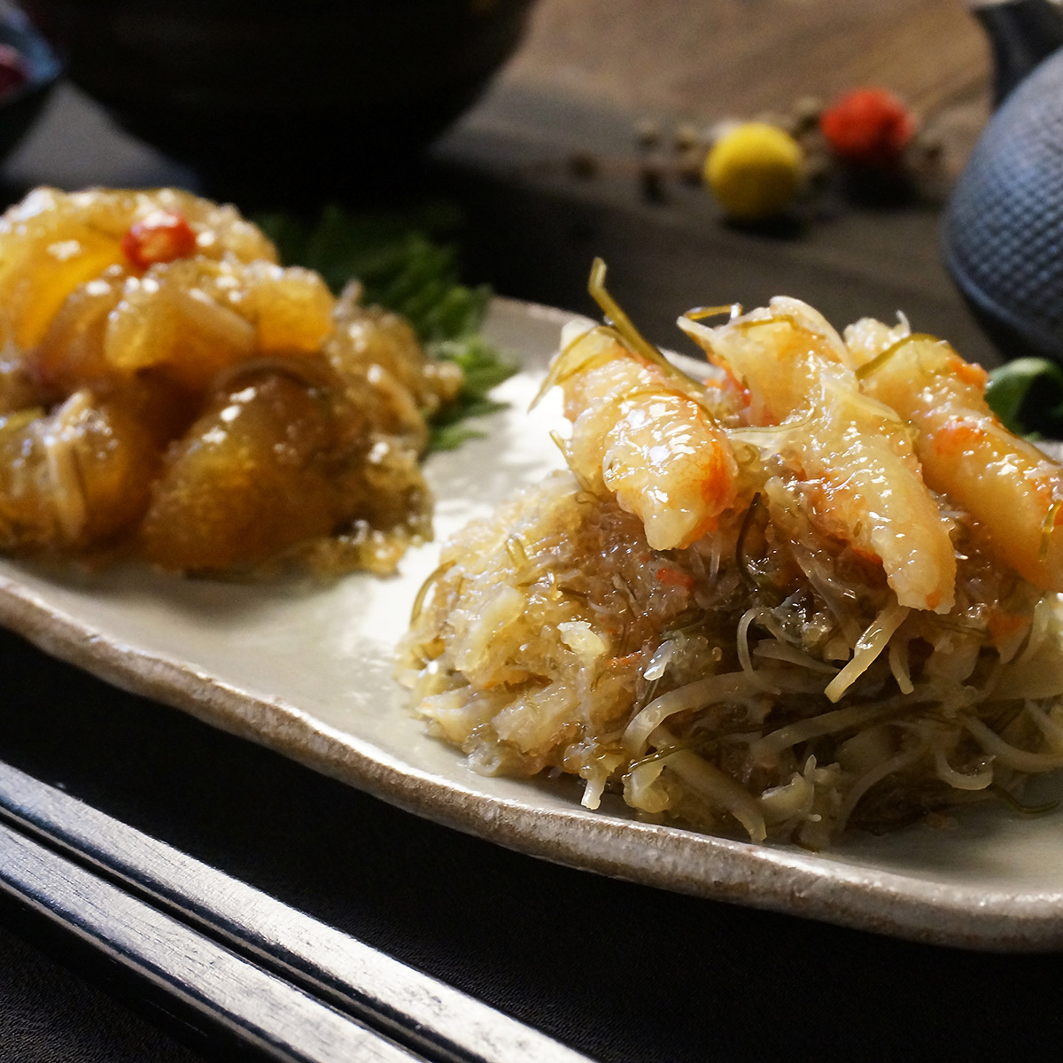◎ネット限定品昆布とイカで仕上げた北海道の郷土料理「松前漬」に数の子を加えた「数の子松前漬」とカニを入れた「かに入松前漬け」のセットです。