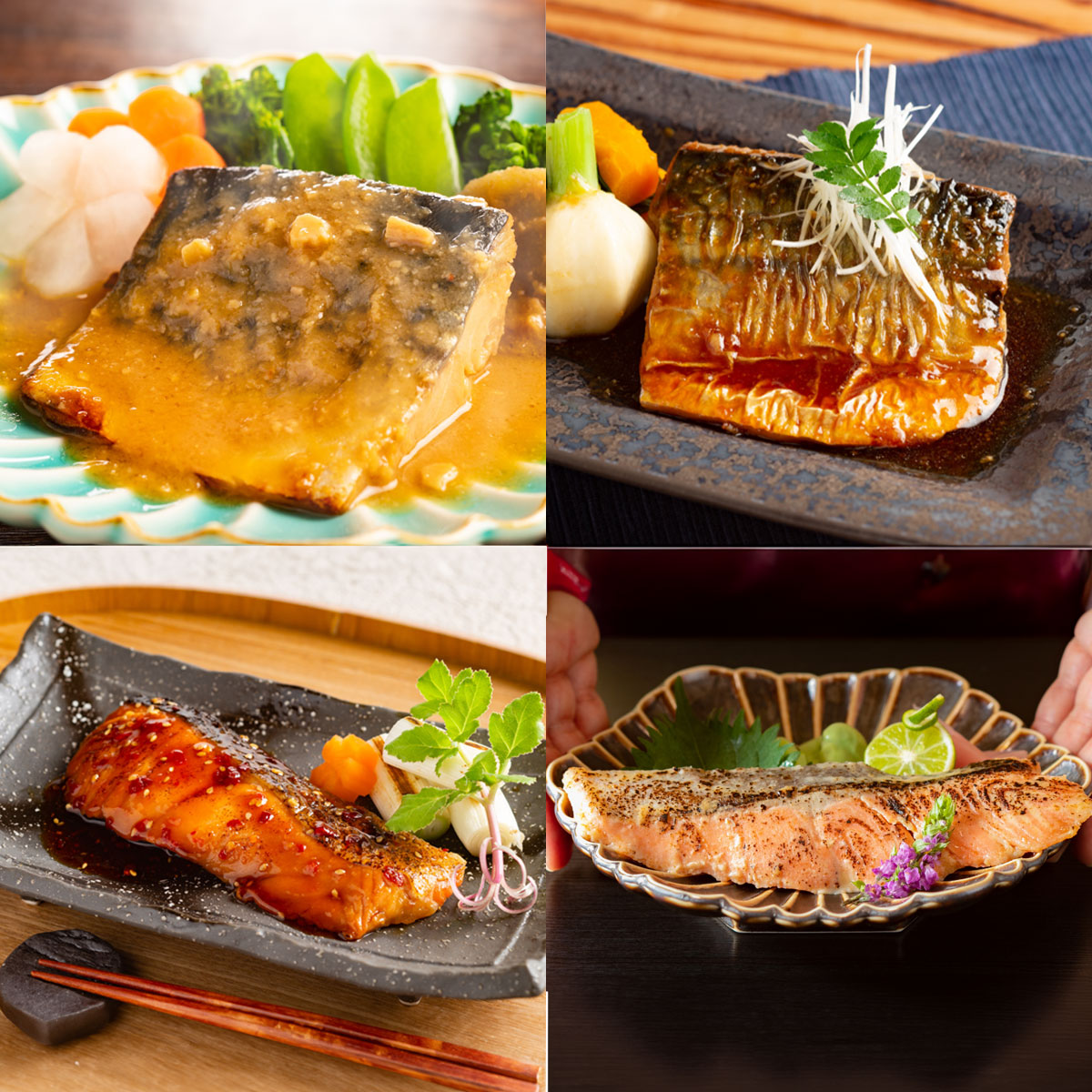 ◎ネット限定品脂乗りの良い鯖を、あっさりした甘みの醤油だれと味噌だれで生姜の香りと共にふっくらと炊いた煮付けと味噌煮、脂の乗った鮭を西京白みそにじっくりと漬け込んで焼き上げた西京焼と甘辛のタレが食欲をそそる照焼、それぞれに下処理をしっかりとしていますので、ふっくら柔らか、骨取りで食べやすく、ご飯のおかずにもお酒のおつまみにもピッタリです。おうちで割烹気分が味わえる本格的な味わいです。