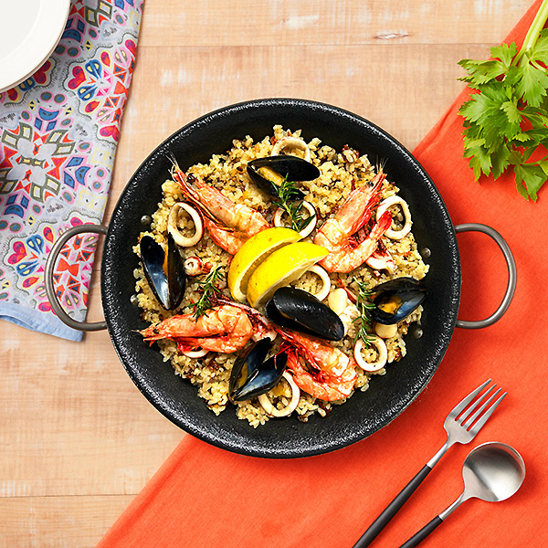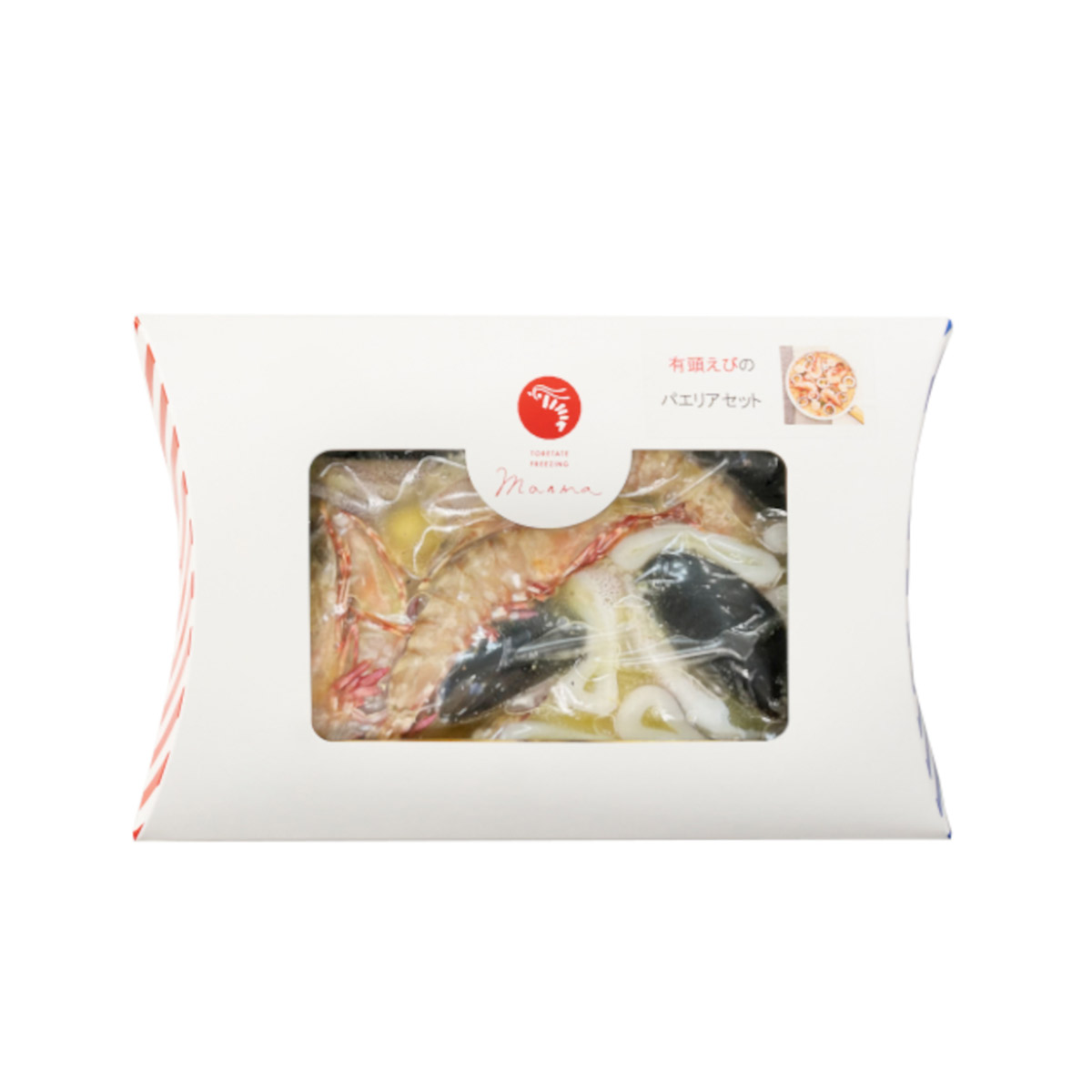 フライパンで簡単調理!豪華な頭付きの「有頭えび」を主役にしたパエリアセットです。ご自宅で家族みんなで作ってみたいパーティーメニュー!このセットで豪華なパエリアが完成するセットです。えび、いか、ムール貝のたっぷりの魚介類、玉ねぎとパプリカなどの野菜の入った特製のスープ、そしてパエリア専用米をセットにしました。有頭えび、いか、ムール貝の3種の厳選した海鮮をオリーブオイル、白ワイン、スパイス調味料などで味付けし冷凍しています。下処理もしていますので解凍後そのままフライパンに入れて炒めてください。スープも解凍してそのままお使いいただけます。