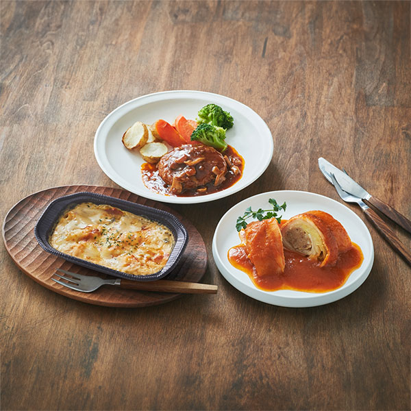 ◎ネット限定品野菜の甘みが感じられるトマトソースでいただく柔らかなロールキャベツと、牛肉100%の旨みたっぷりのハンバーグ、なめらかでコクのある味わいのベシャメルがおいしいグラタンの詰め合わせ。