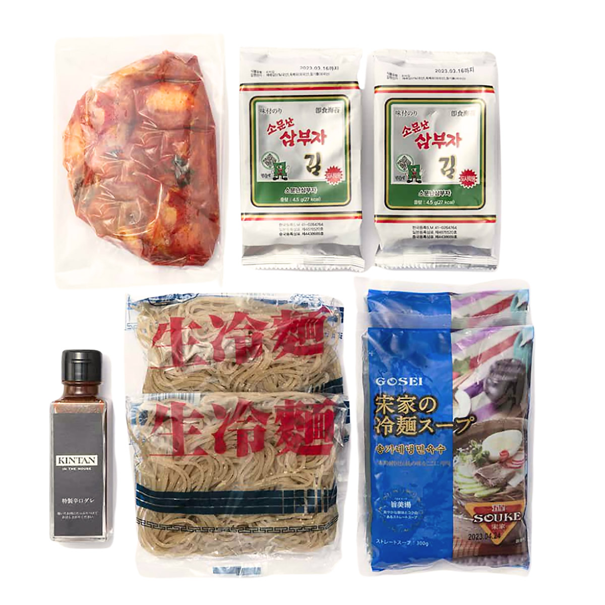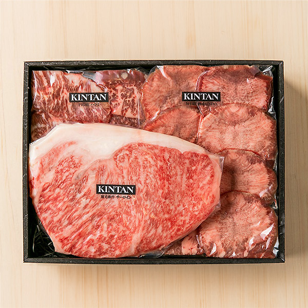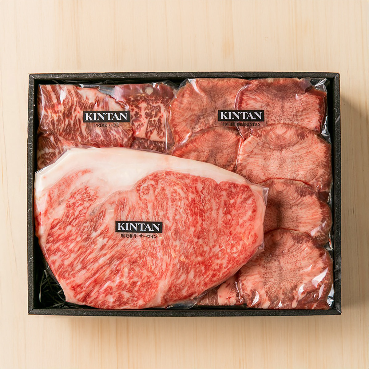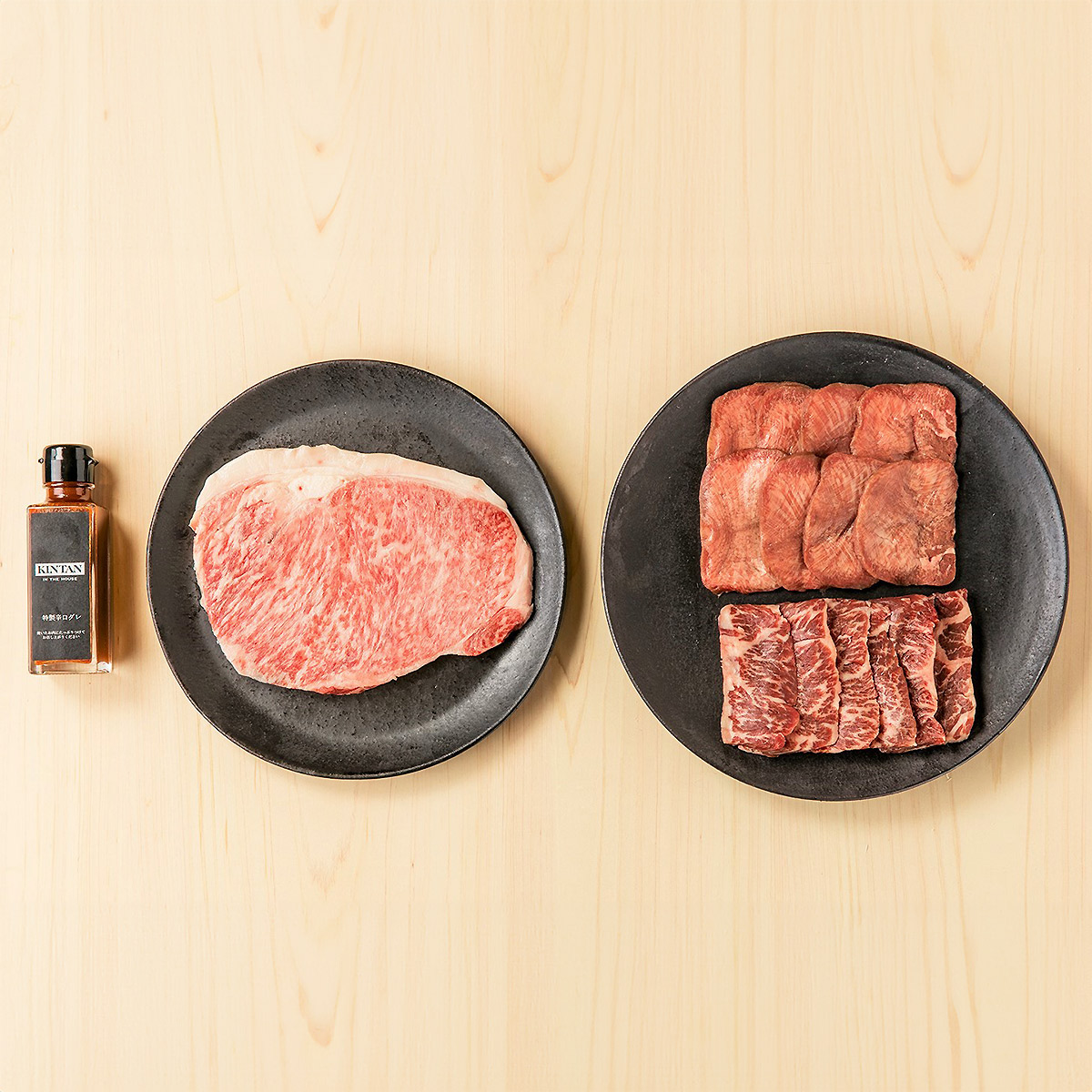KINTANの上質なお肉を味わう、ボリュームたっぷり3~4人前の焼肉セットです。名物の『30日間熟成タン』とジューシーな『プライムハラミ』、黒毛和牛『サーロイン』の3種類入り。冷凍しない生の状態で、美味しさをそのままお届けします。セットには、ごはんにもお肉にもよく合う『KINTAN焼肉のタレ』と焼肉のおともにピッタリな『特製キムチ』、『韓国海苔』、締めの『冷麺セット』も含まれるので、届いた商品だけで、お店と変わらない本格的な味わいを自宅で楽しめます。大判サーロインの登場で盛り上がる事間違いなしのリッチ焼肉セットは、大切な人への内祝いやグルメな方への贈り物、家族や友人とのホームパーティーにもオススメです。