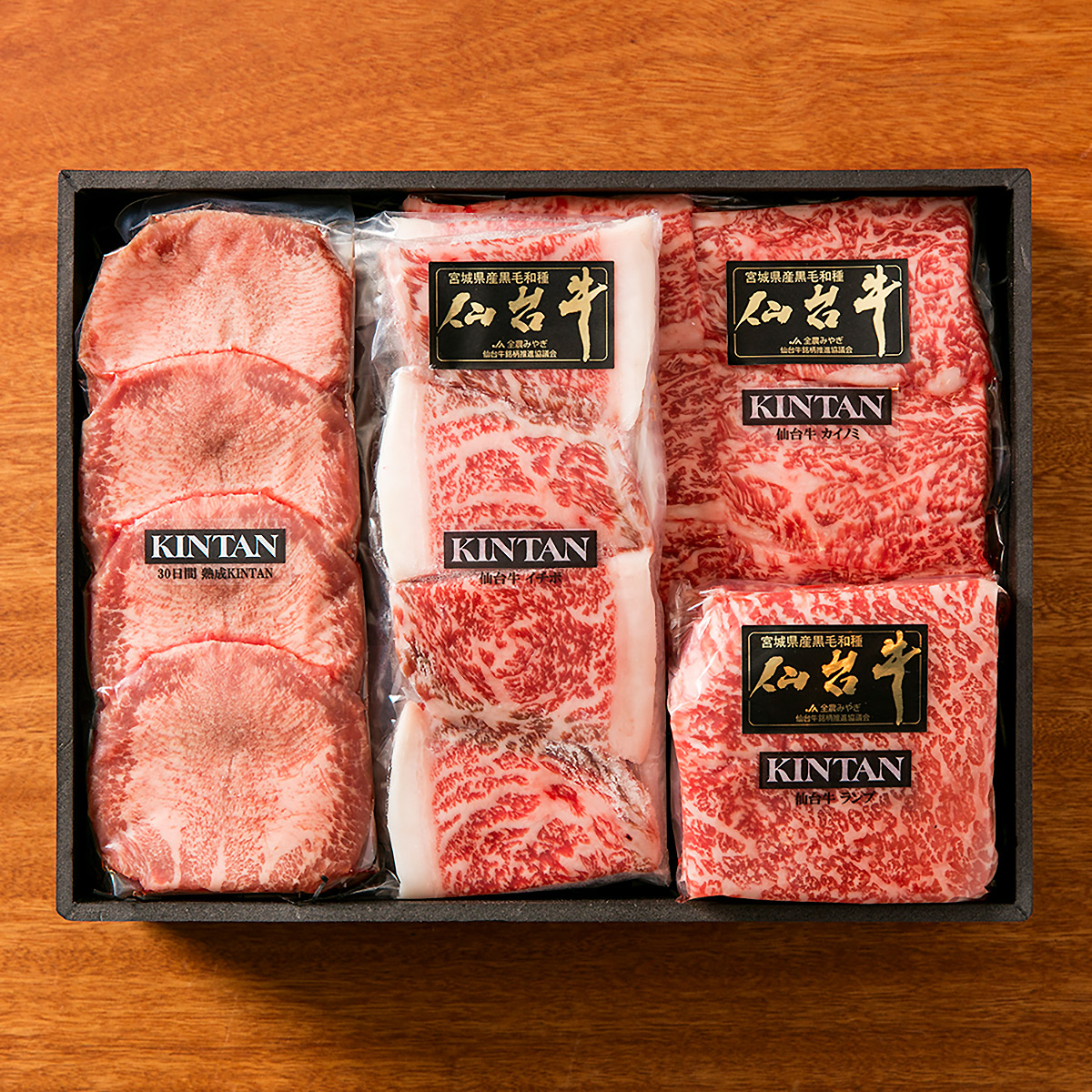 仙台牛のとろける食感を楽しむ、ボリュームたっぷり3~4人前の焼肉セットです。仙台牛は全国で唯一、肉質等級が最高の「5」に格付けされないと呼称が許されないブランド和牛です。名物の『30日間熟成タン』と仙台牛『上カルビ』、仙台牛『ランプ』、仙台牛『イチボ』の4種類入り。冷凍しない生の状態で、美味しさをそのままお届けします。セットには、ごはんにもお肉にもよく合う『KINTAN焼肉のタレ』と焼肉のおともにピッタリな『特製キムチ』、『韓国海苔』、締めの『冷麺セット』も含まれるので、届いた商品だけで、お店と変わらない本格的な味わいを自宅で楽しめます。上質なブランド和牛の仙台牛焼肉セットは、大切な方へのプレゼントやグルメな方への贈り物、家族や友人との思い出をつくる特別なホームパーティーにぴったりです。