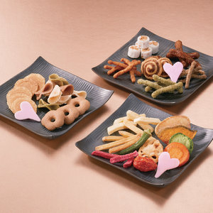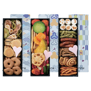 <東急百貨店限定>昔ながらの菓子を新しいスタイルでご提案する、小粋なおいしさ揃い。そばぼうろや生姜煎餅などの煎菓と、オクラや赤大根などをカラリと揚げた野菜チップス、そしてシナモンや黒糖などで風味付けしたかりんとう。多彩なおいしさを、日本の伝統柄をデザインした缶に詰めました。