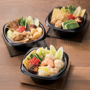 生麩を使った鍋と、みぞれ仕立ての雪見鍋、すき焼鍋。京の名店が趣向を凝らした3種の鍋を揃えました。