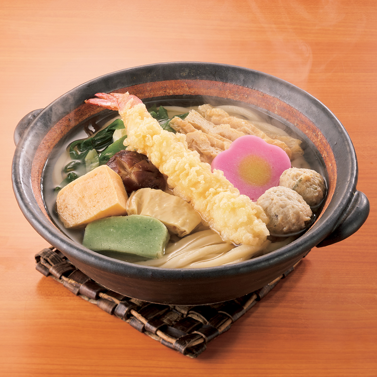 京風のうどん出汁に京都の一品具材や店内で手揚げした海老の天ぷらなどを盛り込みました。アツアツの鍋焼きはご自宅でいただく冬の一品です。
