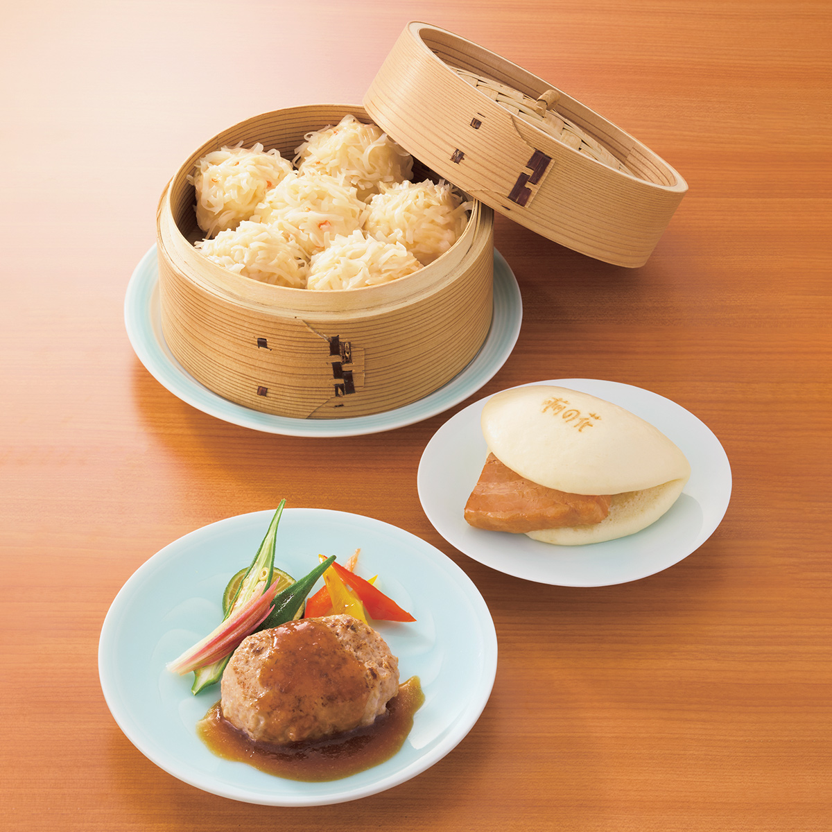 とうふしゅうまい、かにしゅうまい、豆腐のしっとりふわふわ感と牛豚肉の旨みを引き立てた豆腐ハンバーグ。店の人気商品を詰め合わせました。