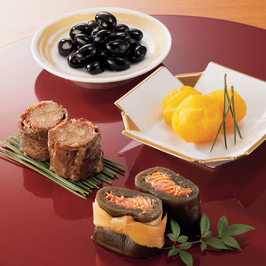 創業以来、愛される牛肉巻や紅鮭昆布巻、栗甘露煮など、料亭が手がけた迎春の美味づくしです。