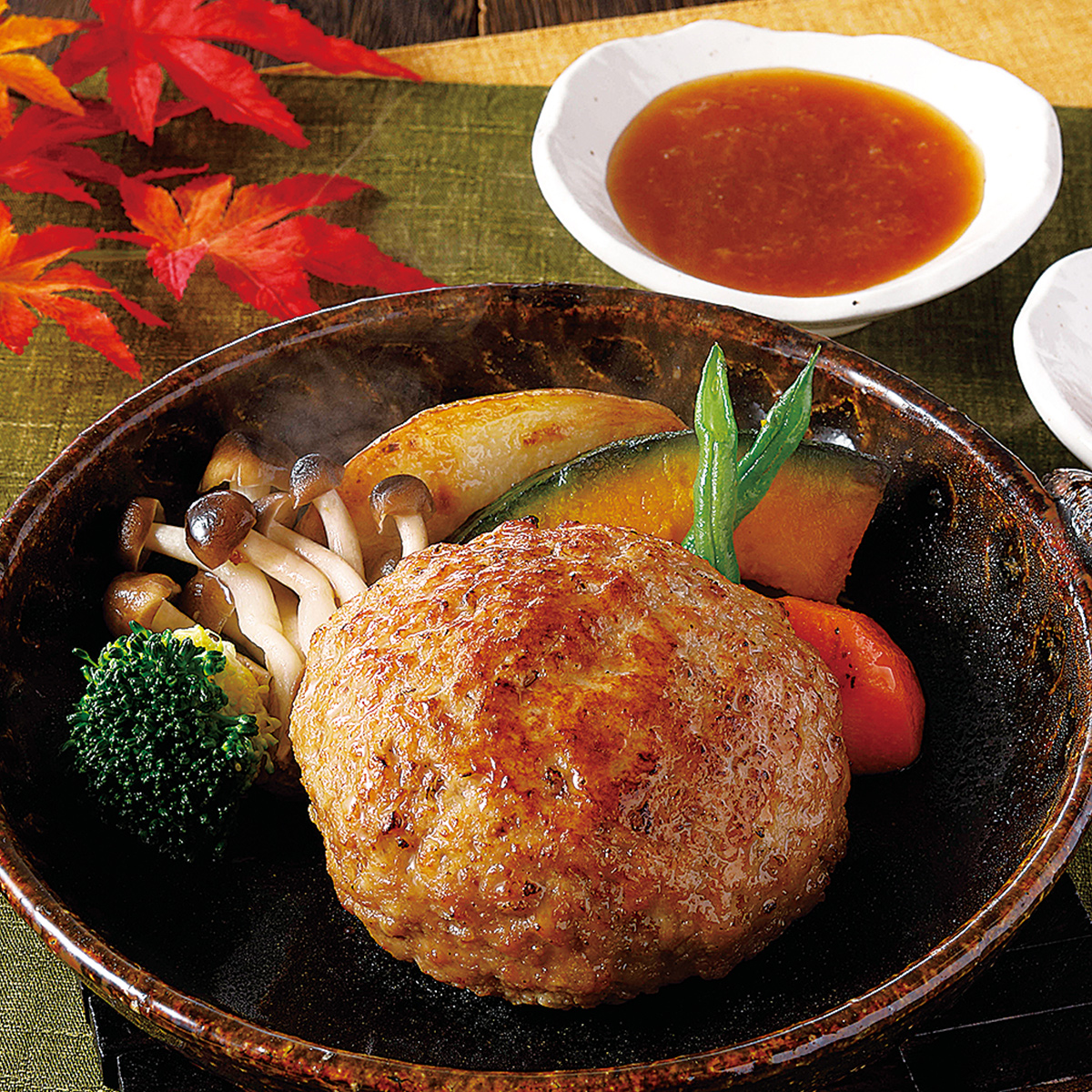 日本料理の老舗が鰹や昆布の旨みを加えて仕上げた、電子レンジで温めるだけのハンバーグ。和風デミグラスソースやおろしぽん酢ソースを添えました。
