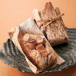 豚の三枚肉を使った長崎の卓袱料理、東坡煮。その旨みを凝縮したたれで炊いたおこわをのせ竹皮で包みました。