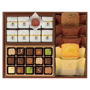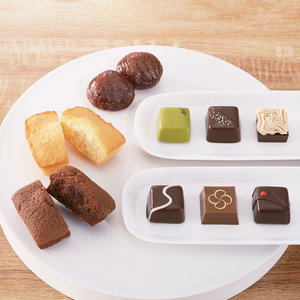 ●内容:チョコレート(ショコラの調べ)×15、黒糖焼酎のマロングラッセ×8、国産バターとカカオのケーキ×3、国産バターと和三盆のケーキ×2