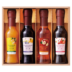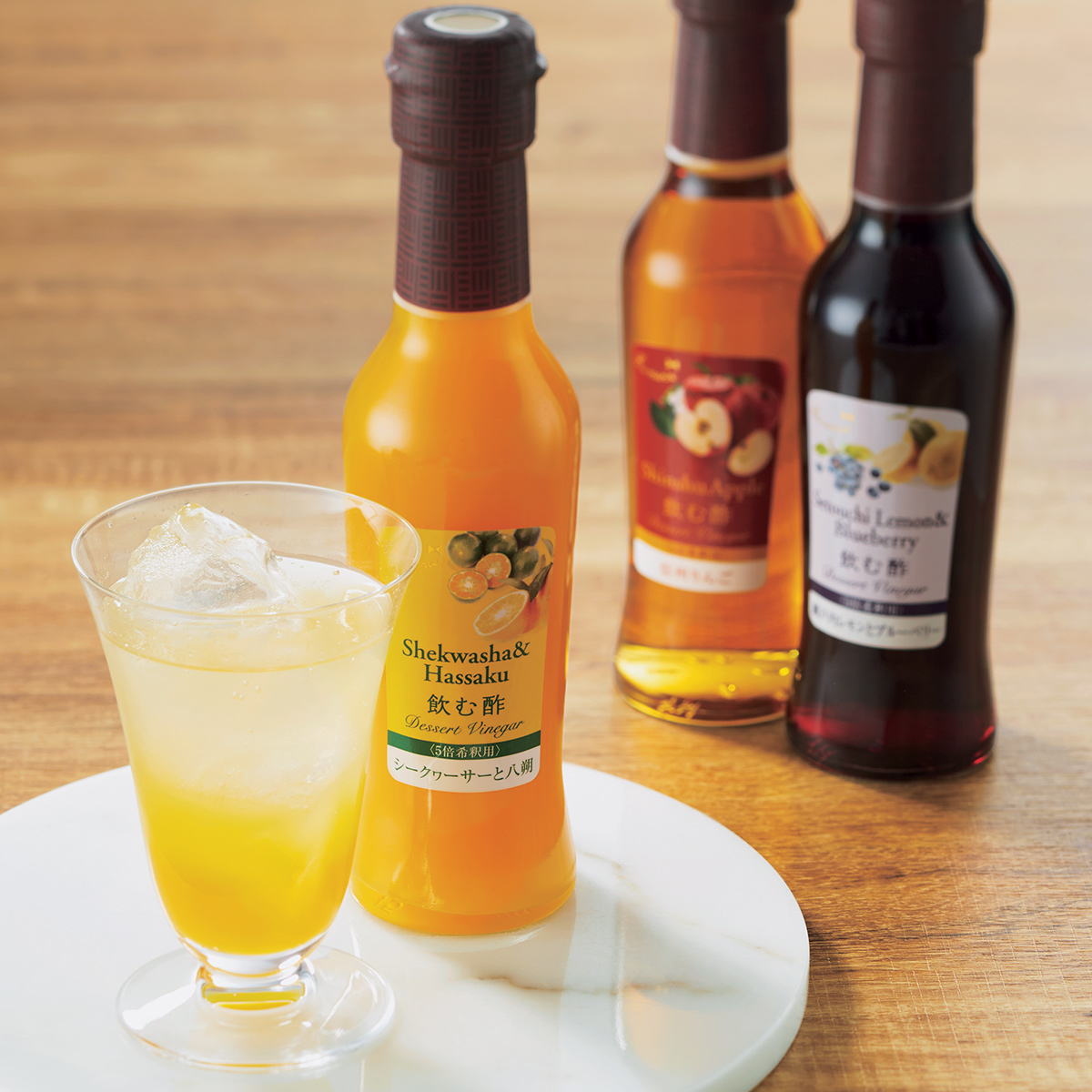 果汁を発酵させた果実酢に、さらに果汁を加えて仕上げた飲む酢デザートビネガー。信州りんごやシークヮーサーと八朔などを揃えました。