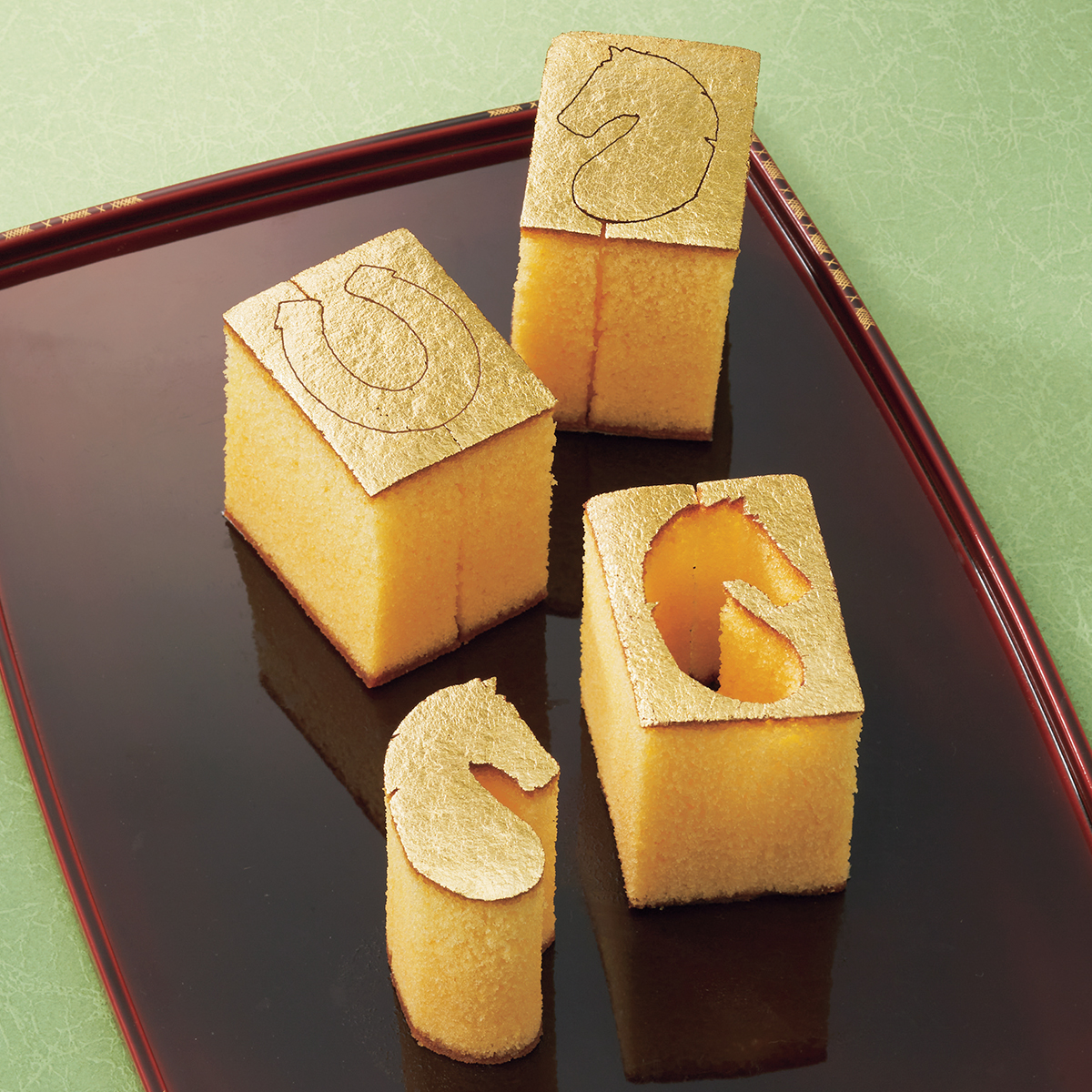 金沢ならではの金箔を贅沢に一枚貼り。2026年の干支「午」の型抜きが楽しめる縁起の良いカステラです。