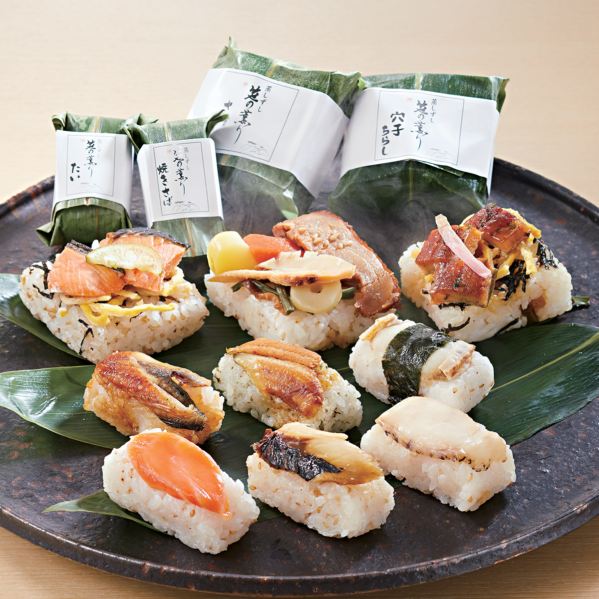 奈良名物の柿の葉寿司や笹巻き寿司で知られる名店が趣向を凝らした美味。穴子や真鯛、鰻など多彩な具材を米とともに笹でつつんで蒸し上げました。電子レンジで温めれば、笹の芳香が広がります。