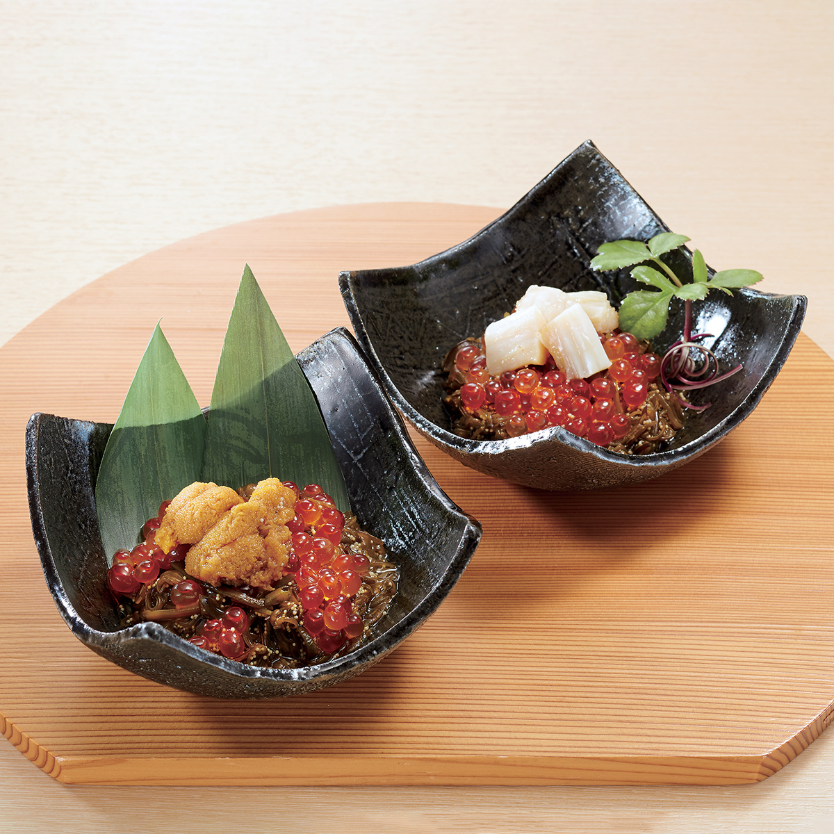 食材の宝庫、三陸の幸を知り尽くした名店の美味。濃厚ないくらやめかぶの醤油漬に、三陸産のうにや酒蒸ししたほたてを盛った海宝漬。1膳分の食べきりサイズを詰め合わせました。白いご飯にぴったり、酒の肴にも絶妙な味わいです。
