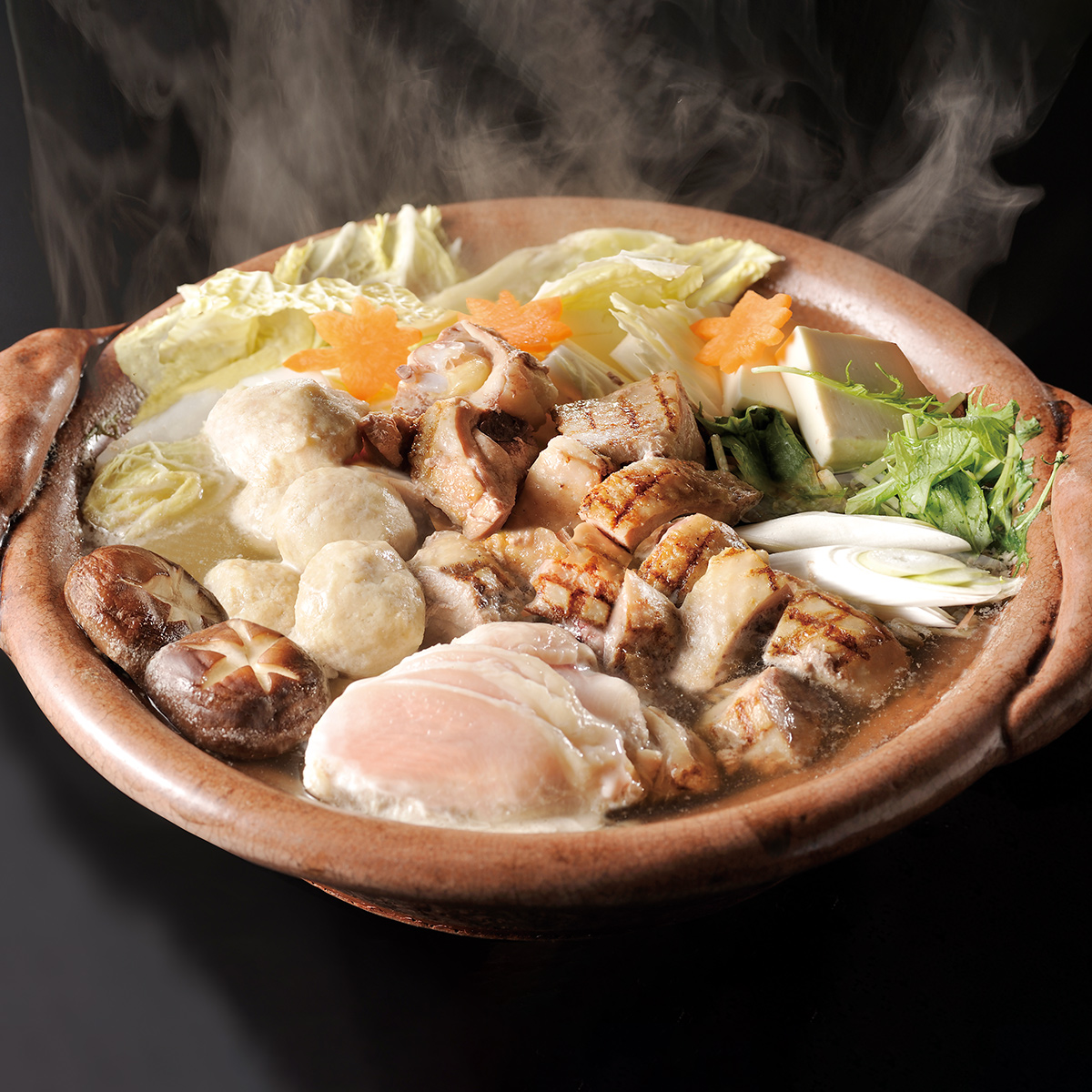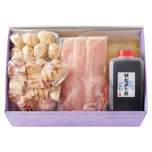 ●内容:鶏もも肉(骨付き)240g、鶏むね肉160g、鶏つくね×10、スープ1000g、ポン酢350g