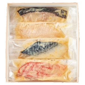 葉山の老舗料亭の技が磨き上げた味わい。老舗が誇る、料亭仕込みの芳醇な西京漬。かながわブランド認定の三崎黒潮キンメに加え、銀鱈、カラス ガレイ、真鯖の計4魚種を、酒粕を加えた特製の西京味噌に漬け込みました。