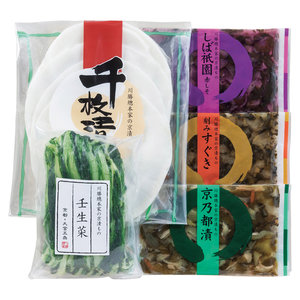 京漬物の伝統を守り、季節を彩る名店。創業以来、一世紀にわたって京漬物ひとすじに精進する名店の美味。古都の風物詩「千枚漬」や、丹念に仕上げた自慢の漬物をバラエティー豊かに詰め合わせました。