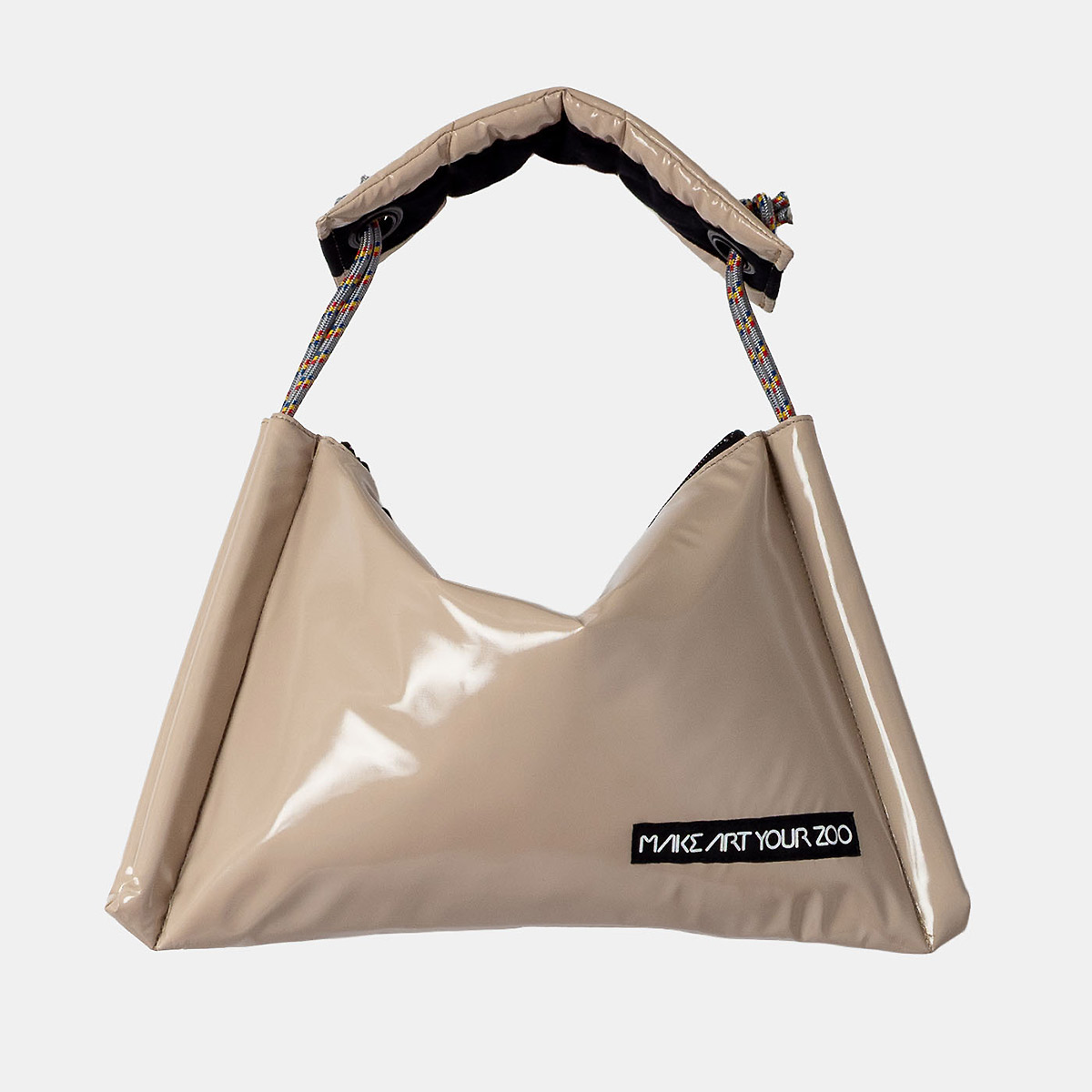 上品な光沢感を醸し出すエナメル調の素材。貴重品とボトルを入れて、ミニマムに持てるサイズ感。短く持つ肩掛けバッグ、手提げバッグとして。コードの結び目で、長さを調節可能。※斜め掛けとしてご利用される場合は、別売りのTASUKI BELTを合わせてご購入ください。