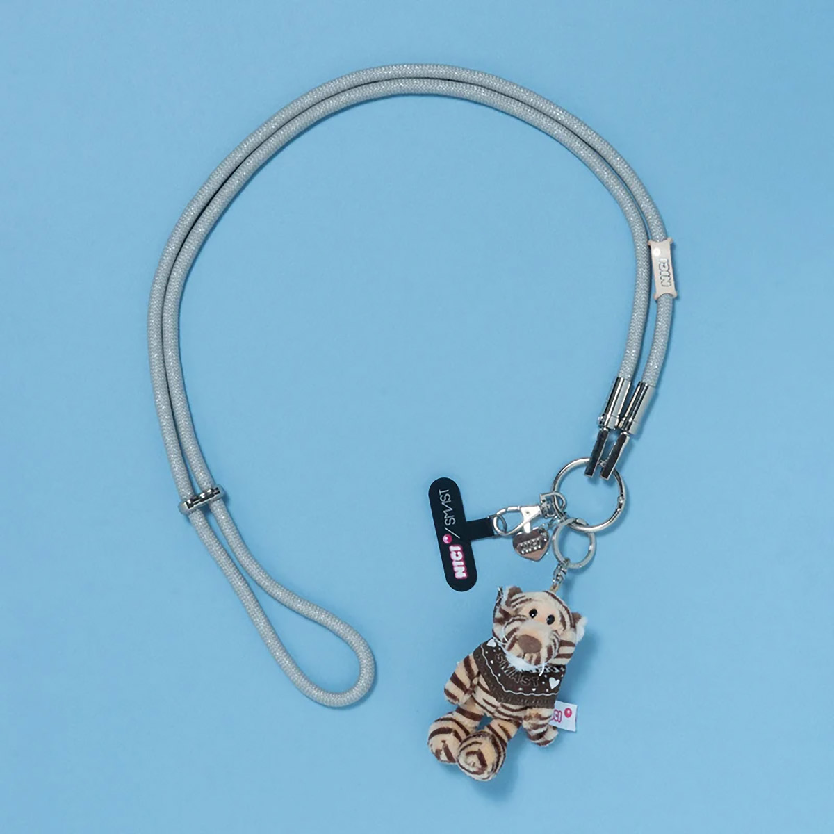 オリジナルのキラキラとした、オーロララメ入りの7mmロープを使用したモバイルストラップに、オリジナルバンダナを巻いたNICI×SMASTの特別なコラボ商品です。
