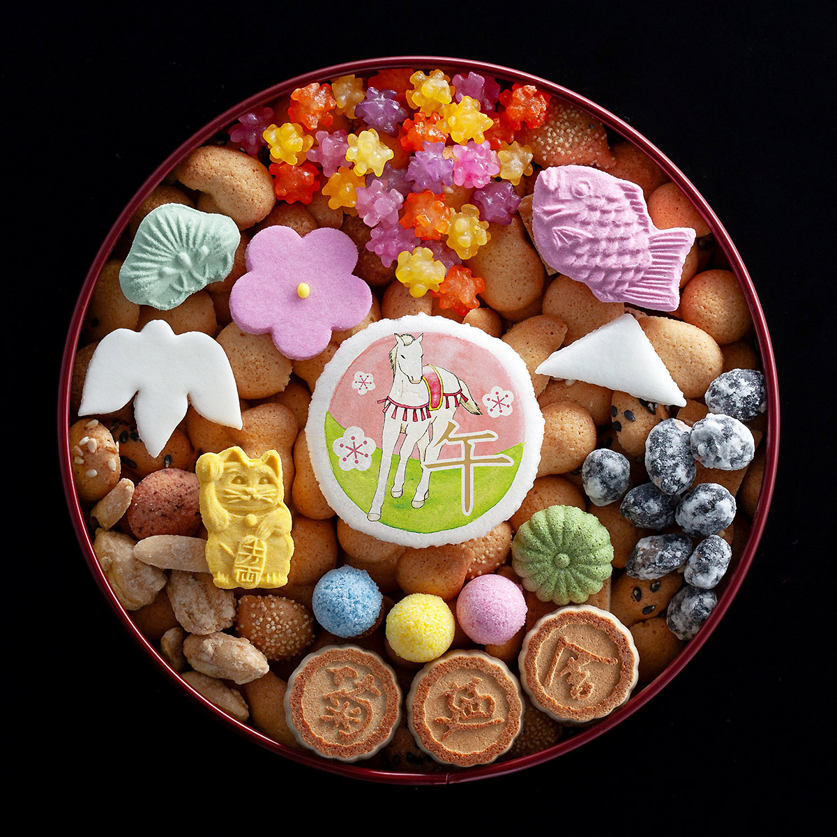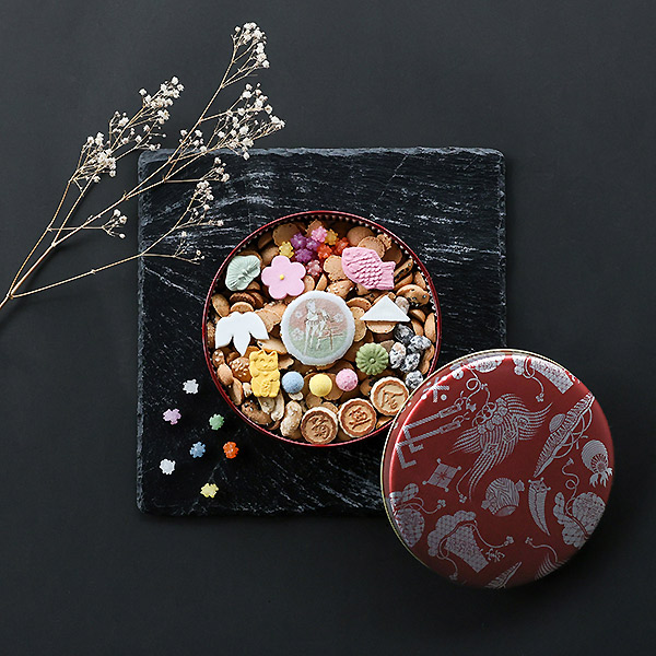 ◎渋谷ヒカリエ ShinQs(シンクス)取扱商品新しい年、すこやかに、おだやかに、素晴らしい年になりますように願いを込めました。松・竹・梅や鯛などの新春にふさわしい打ち物や、干支をあしらった麩焼き、和三盆などを、全ての福を集めた「開運干支缶」です。