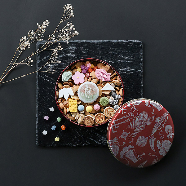 ◎渋谷ヒカリエ ShinQs(シンクス)取扱商品富士山と日本の四季を江戸和菓子で表現した「特撰缶JAPAN」。松・竹・梅や鯛などの新春にふさわしい打ち物や、干支をあしらった麩焼き、和三盆など全ての福を集めた「開運干支缶」とのセットは期間限定です。