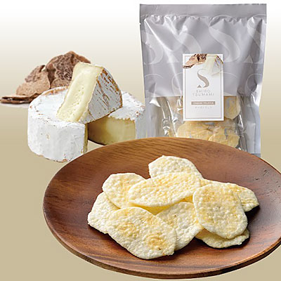 極限まで薄く仕上げたしろえびせんべいにチーズと白トリュフで味付けした一品です。