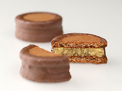 ラム酒で調味した栗餡をココア入りのビスケットでサンドして、まわりをミルクチョコレートでコーティング。