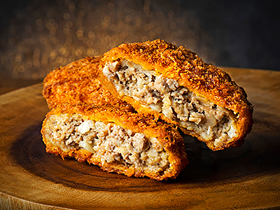 赤身肉の旨みとジュージーな脂が混ざりあった独自の配合。粗挽き肉を細切れ肉で包んだ2層仕込みのメンチカツです。