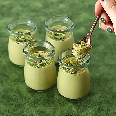 ピスタチオをふんだんに使用した、風味を存分に楽しめる濃厚な味わいのプリン。