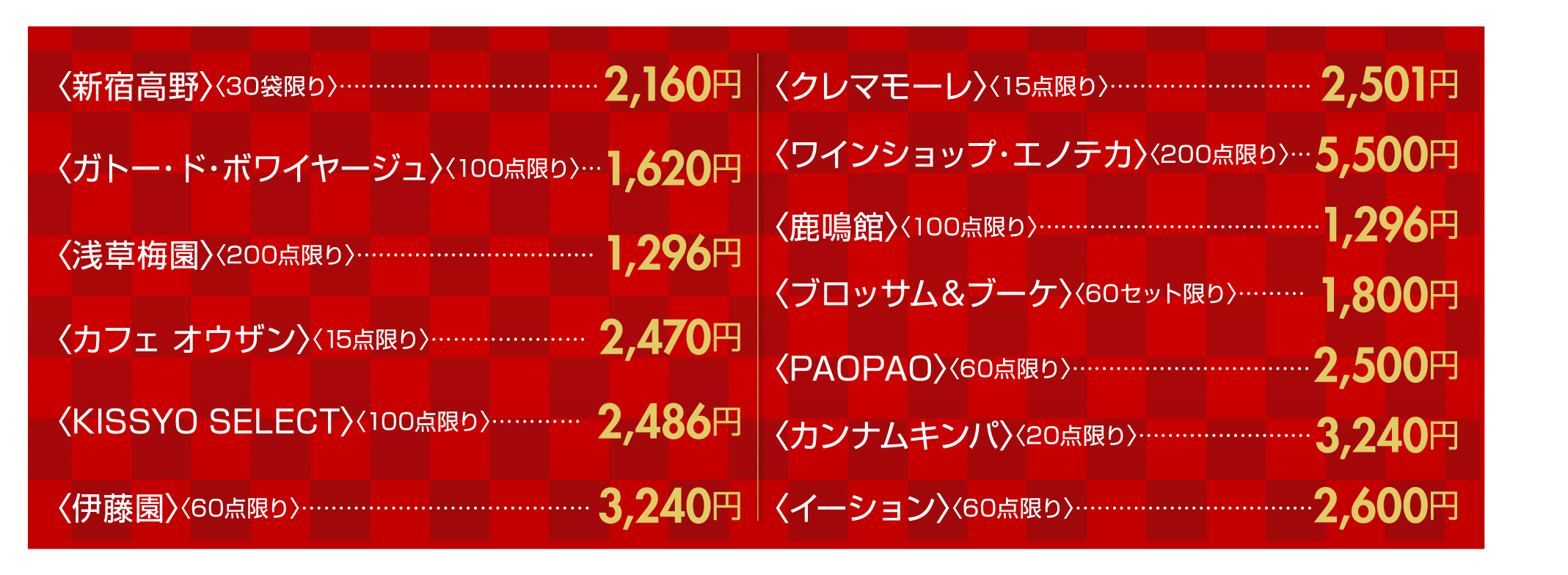 予告新春初売り 美味しい福袋 2026年1月2日(金) あさ10時スタート! おすすめ 期間限定 予告 売り切れ御免!各ショップの「美味しい」福袋を数量限定で販売いたします。※無くなり次第終了となります。※記載以外の福袋も販売いたします。 ※表示価格は標準税率10%(軽減税率対象商品は8%)の消費税を含んだ税込価格です。なお、軽減税率対象商品において、用途により軽減税率が適用されない場合がございます。詳しくは売場係員におたずねください。 ※数量に限りがございますので、売切れ・品切れの際はご容赦願います。 ※記載以外の商品は参考商品です。