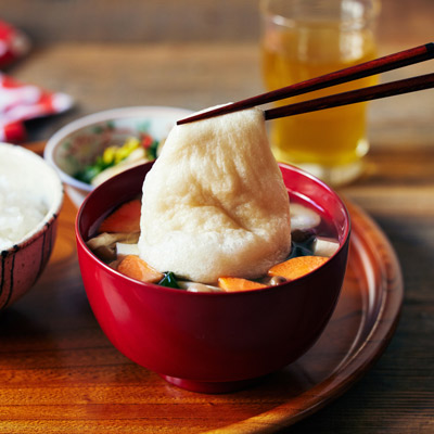 こぶし大の大きなお麸!お麸の裏に穴を開け、お味噌汁やお吸い物の上に乗せるだけ。もちもち食感がたまりません。