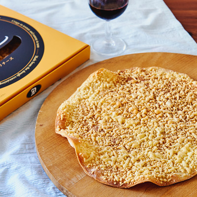 兵庫県のパン屋さんがつくる自慢のおつまみ!じっくりと寝かせたパン生地に、特徴の異なる2種のチーズをのせてパリパリに焼き上げました!