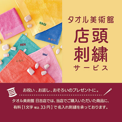 入園入学などのお祝いギフトに、タオルへのネーム刺繍や部活動プチ刺繍などの刺繍サービスを承っております。