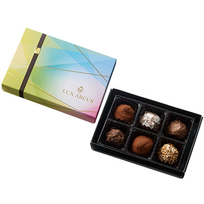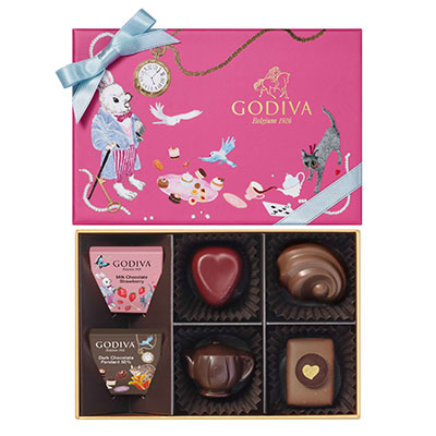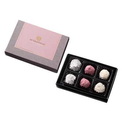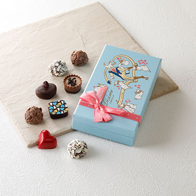 ブランドを代表する伝統の「トリュフ」2粒と、ホワイトチョコフレークで贅沢に飾った新作トリュフ「スノーフレーク」、日本オリジナルテイストの「レッドハート」などトリュフ2種と人気ショコラ4種を"ウサギのテーマパーク"をイメージした心弾むボックスに詰め合わせました。