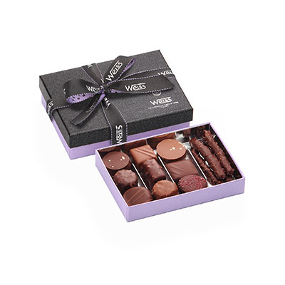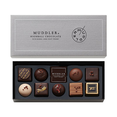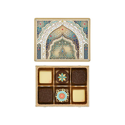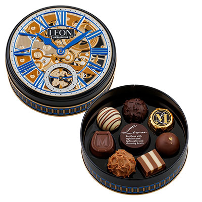 歯車などの内部機構を全面的に見せることで、上質な立体感と高級感を演出しています。風味豊かなトリュフや馬蹄型など8種のチョコレートを詰め合わせました。