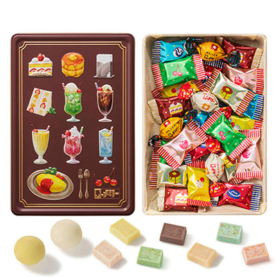 全種類のはじけるキャンディチョコレートを喫茶店のメニューをイメージした缶に集めました。