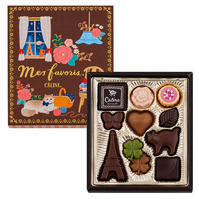 パリをイメージしたエッフェル塔や可愛らしい猫、クローバーやバラなどキュートな形のチョコレートを詰め合わせました。