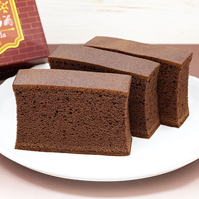 カステラの生地にココアパウダーを混ぜ込んだ「ココアカステラ」は、ほんのり甘く、ほのかな苦味のあるココアの風味を巧みに引き出したやさしいお味です。