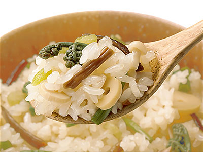 素朴で懐かしい味わいの山菜おこわを蒸したててでご用意します。