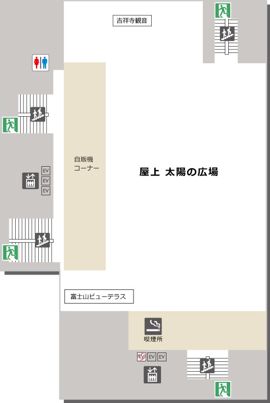喫煙所 10:00~21:45 ※17時以降は南側エレベーター・階段よりお上がりください。 |