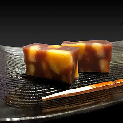 国産生栗が入った甘さ控えめのなめらかな羊羹。しっとりとした食感に栗の風味が広がるこの季節だけの数量限定商品です。