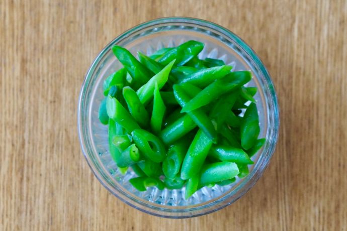 3. さやいんげんは塩ゆでし、斜め薄切りにする。*ここまで前日に準備し、容器に入れ冷蔵庫で保存
