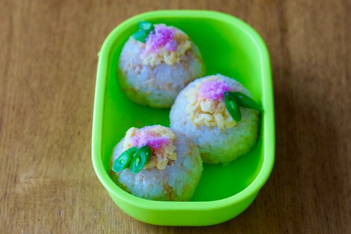 4. 子どものおにぎりに桜でんぶとさやいんげんを飾る。