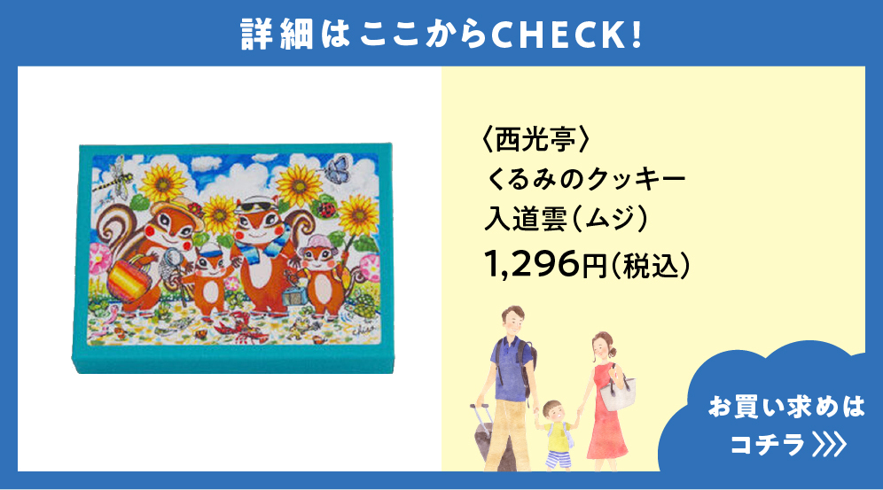 たっぷりの粉糖に包まれた、ころんとかわいらしいクッキーは、<西光亭>の人気商品。さっくり、ほどけるような食感のあと、たっぷり練り込まれたくるみの香ばしさを残します。リスが主役のパッケージイラストは季節やイベントにあわせて描かれ、この時期は、入道雲をバックに笑顔を見せるリスの家族がお目見え。ほろりとやさしいクッキーのように、受け取った方も思わず頬がゆるむことでしょう。