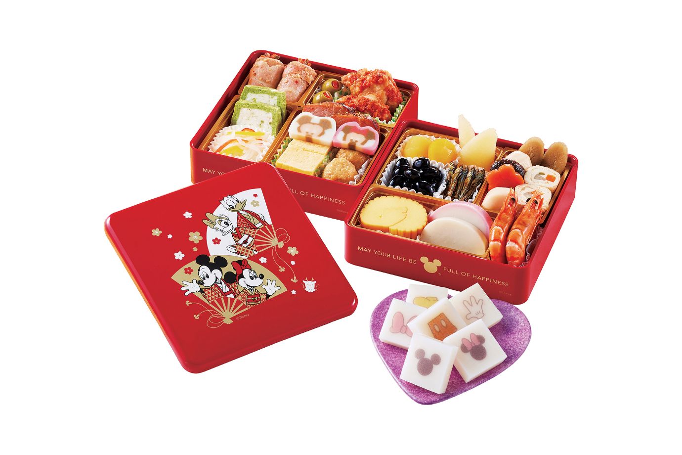 ミッキー&ミニー、ドナルド&デイジーが愛らしいお重に、バラエティ豊かな24品を詰合せました。一の重には蒲鉾や伊達巻から煮しめまでそろった和の料理、二の重には「鶏のトマト煮」「ローストポーク」「海老とブロッコリーのテリーヌ」など。さらに、ミッキーやミニーをモチーフにしたイラストがプリントされたかわいい切り餅も付いています。