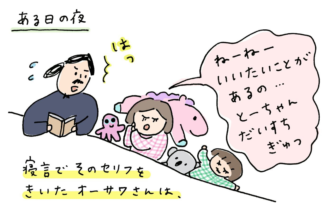 ある日、まなつが寝言でそのセリフを言ったのを聞いて、ハッとして、「次言われたらちゃんとぎゅーっと返してあげよう」と心に決めたそうです。
