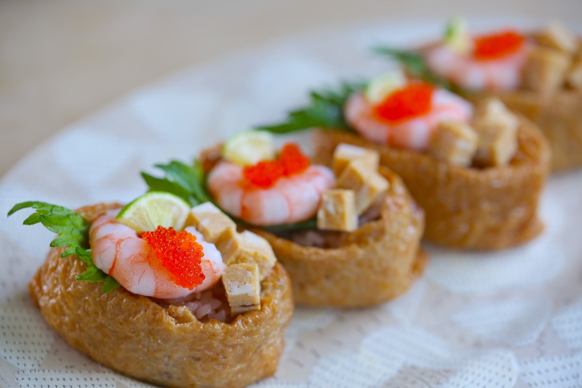 3.1に大葉、むき海老、卵焼き、とびっこ、すだちを飾る。